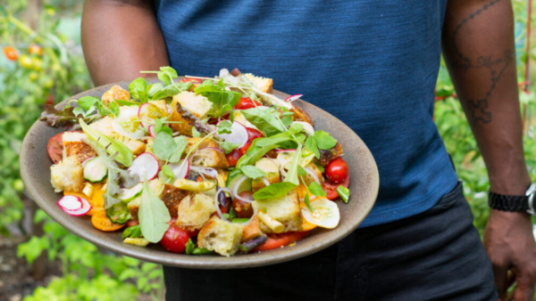 Lidia hosts a celebratory meal for the volunteers featured in her special Lidia Celebrates America: A Nation of Neighbors. She invites guests to help her prepare this Roasted Beet and Peach Salad recipe for the meal. “This is a great salad,” Lidia says. “No waste of food. You use the beet, the stem and the leaves, everything goes in the salad and it’s delicious. And in the wintertime you can substitute the apples instead of the peaches. You can use whatever is in season.”